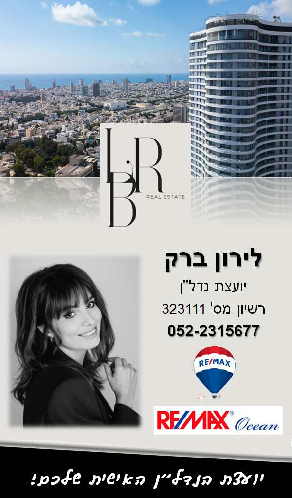 מק"ט: שמי לירון ברק ואני יועצת נדל"ן במשרד תיווך רי/מקס אושן תל אביב. אזור התמחותי הינו הצפון הישן, מרכז ולב תל אביב. במסגרת עבודתי אני מתמחה במכירת דירות יד שניה, ראשונה ושכירויות. רוצים לקנות או למכור נכס ולקבל שרות אמין ומקצועי? צרו קשר עוד היום כמוכר השיטה שלי נותנת חשיפה מקסימלית לנכס שלך, טיפול מסור ואמין לאורך כל תהליך המכירה! כקונה תוכל למצוא אצלי מגוון דירות גדול שיתאים לצרכים שלך, בליווי צמוד עד למציאת הנכס הבא שלך רוצה תיווך ברמה אחרת ? תנסה אותי !!