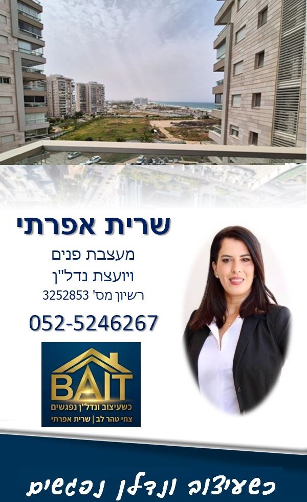 שרית אפרתימעצבת פנים המשלבת יעוץ נדל״ן מקצועי, מעניקה ללקוחותיי חווית תהליך כוללת-מהבחירה בנכס הנכון ועד לעיצובו המושלם!